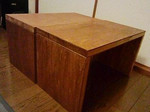 2007-02-06 その後の座卓2 表側の広い場所は二度塗り完了。乾かし中。 ちなみに塗ってるのはオイルフィニッシュなので塗って置いて拭いてヤスって乾かし。 あとは脇を塗らないとなあ。ちょっと飽きてきた。ぷ。 この2つ、昨日も書いたけど5mm高さが違います。惜しい。実に惜しい。
